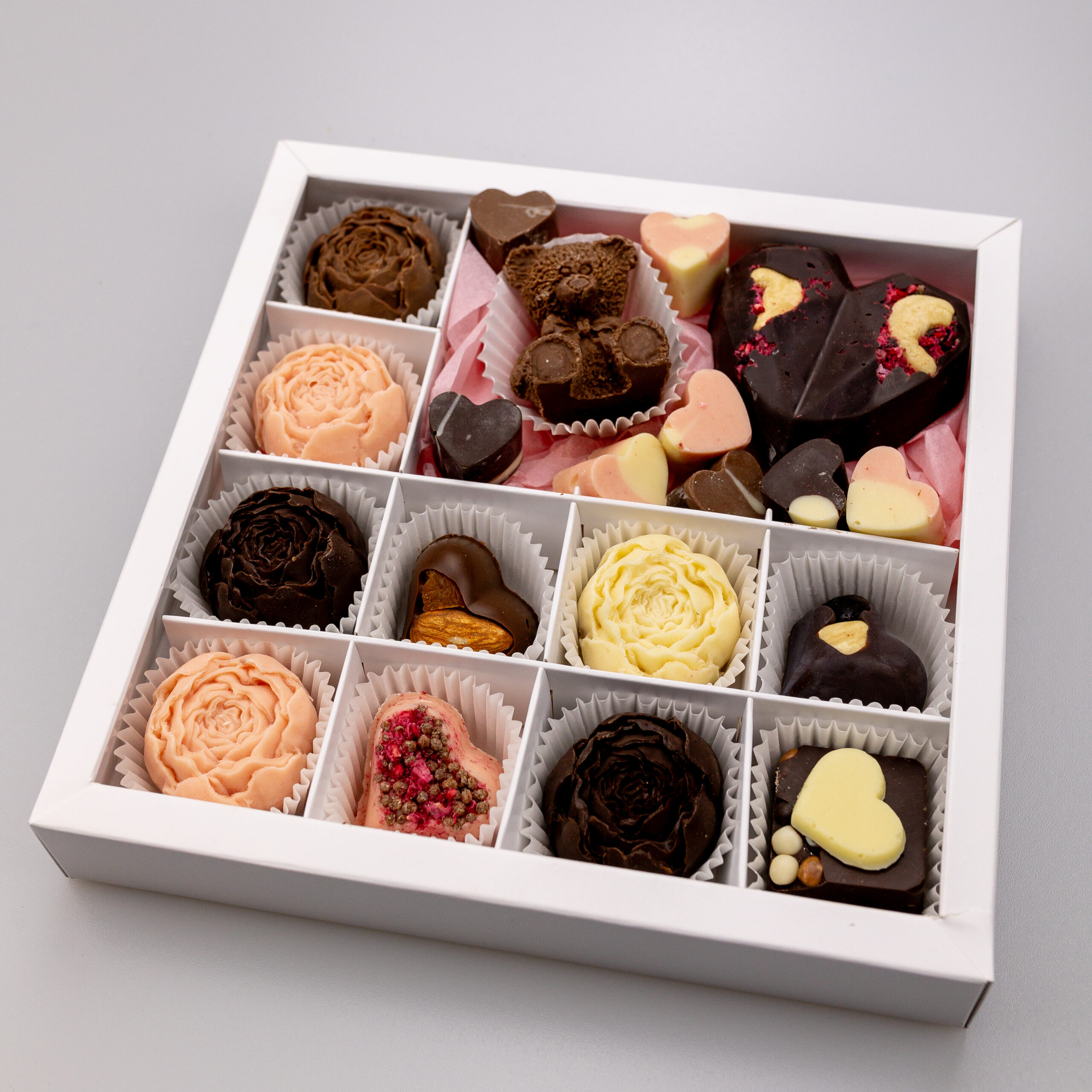 Ніжна композиція з шоколадних півоній, серця та ведмедика — ідеальний подарунок для особливих моментів. Гармонійне поєднання різних видів шоколаду та начинок створює вишуканий смак і ефектний вигляд ❤️