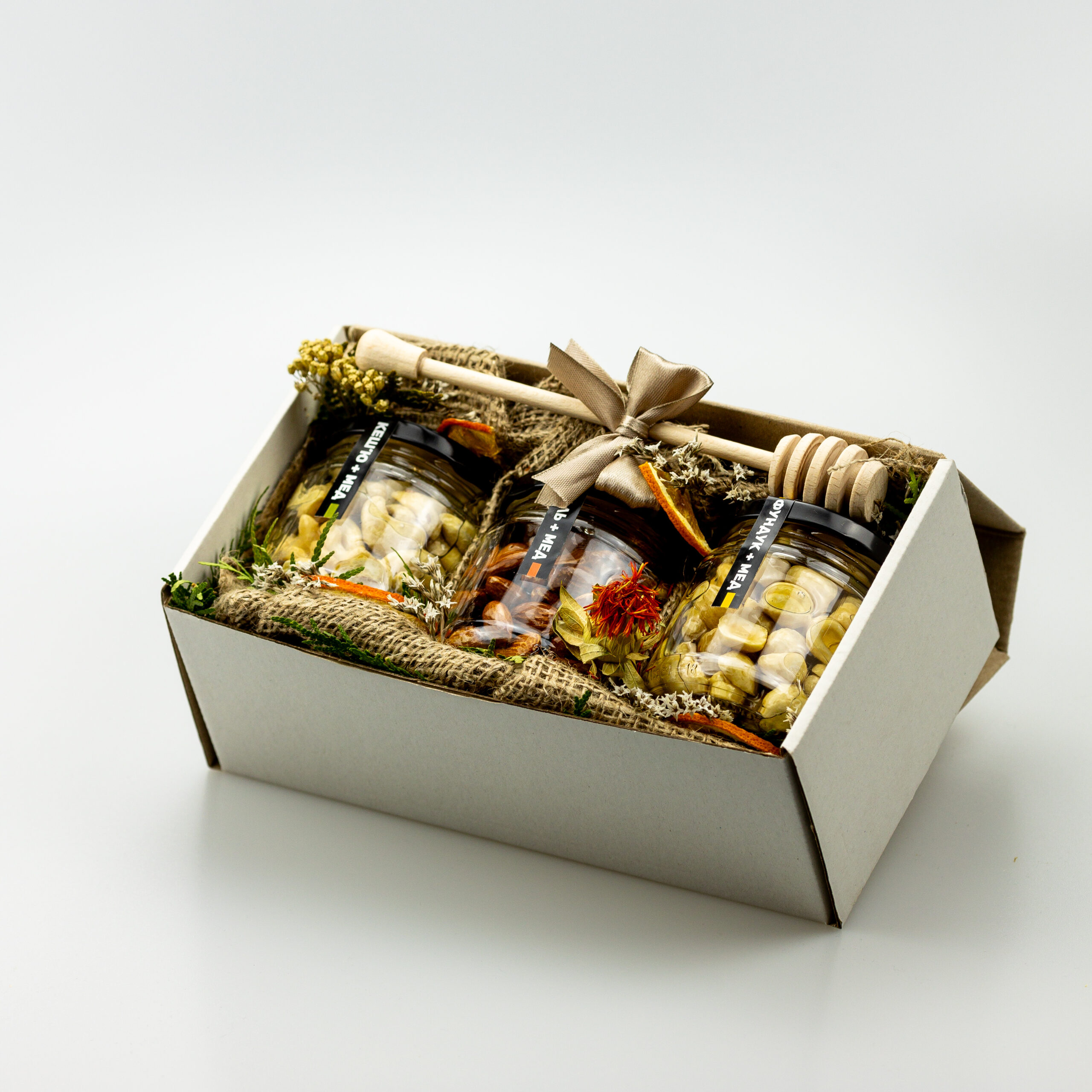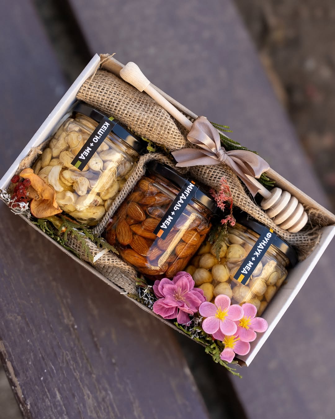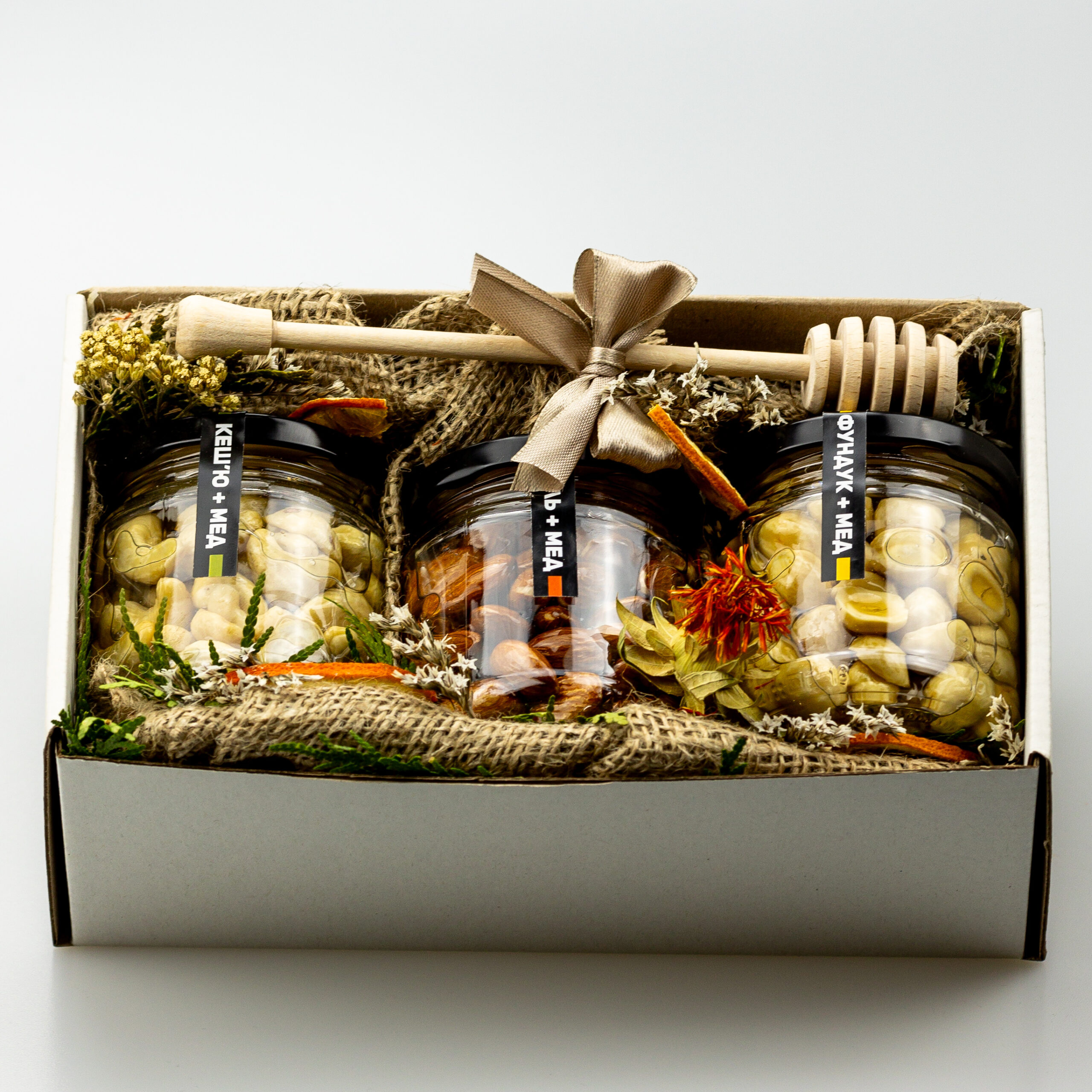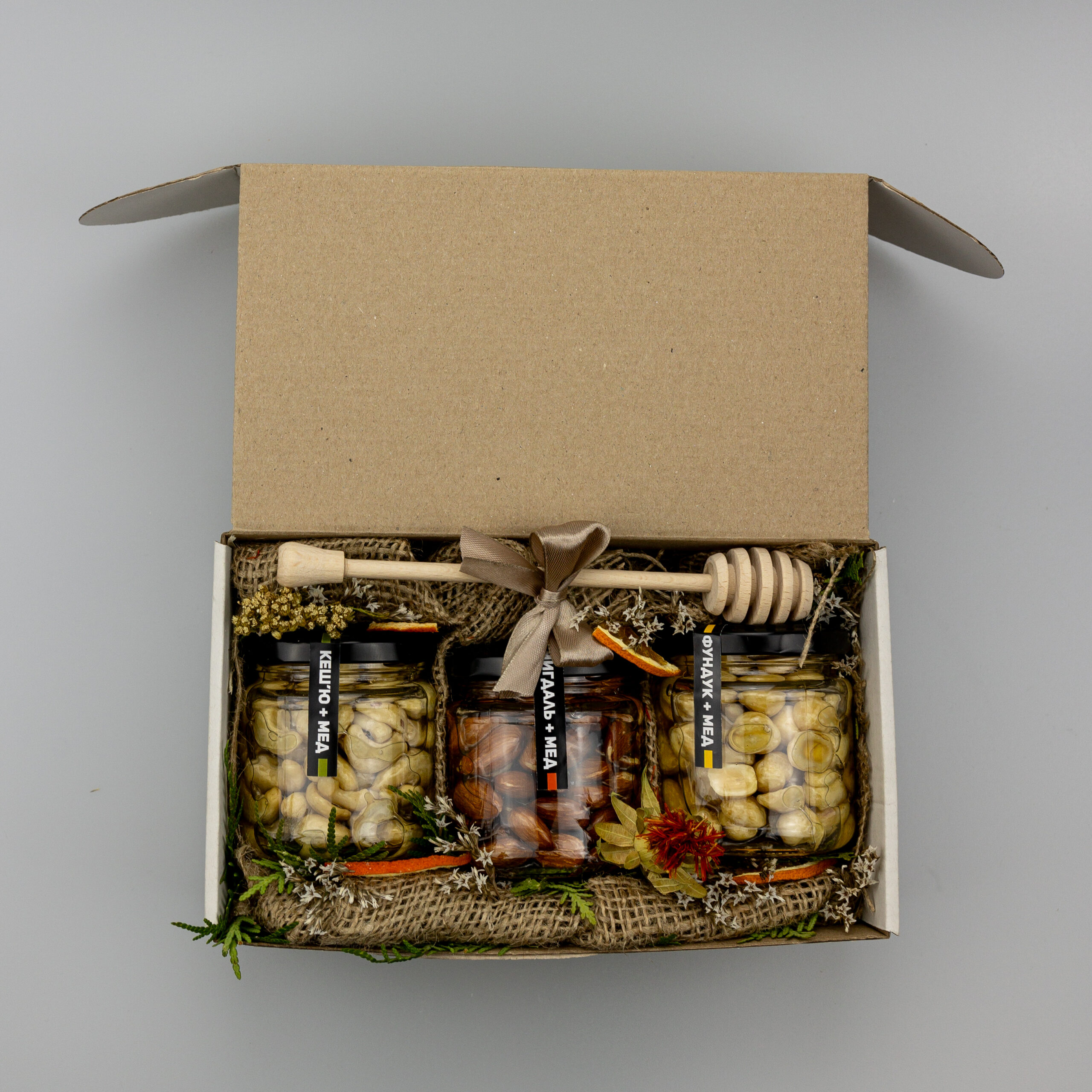 Смачний та корисний подарунковий набір на основі натурального меду різнотрав’я з різними наповненнями. Ідеальний варіант для тих, хто любить поєднання меду з горіхами 💛