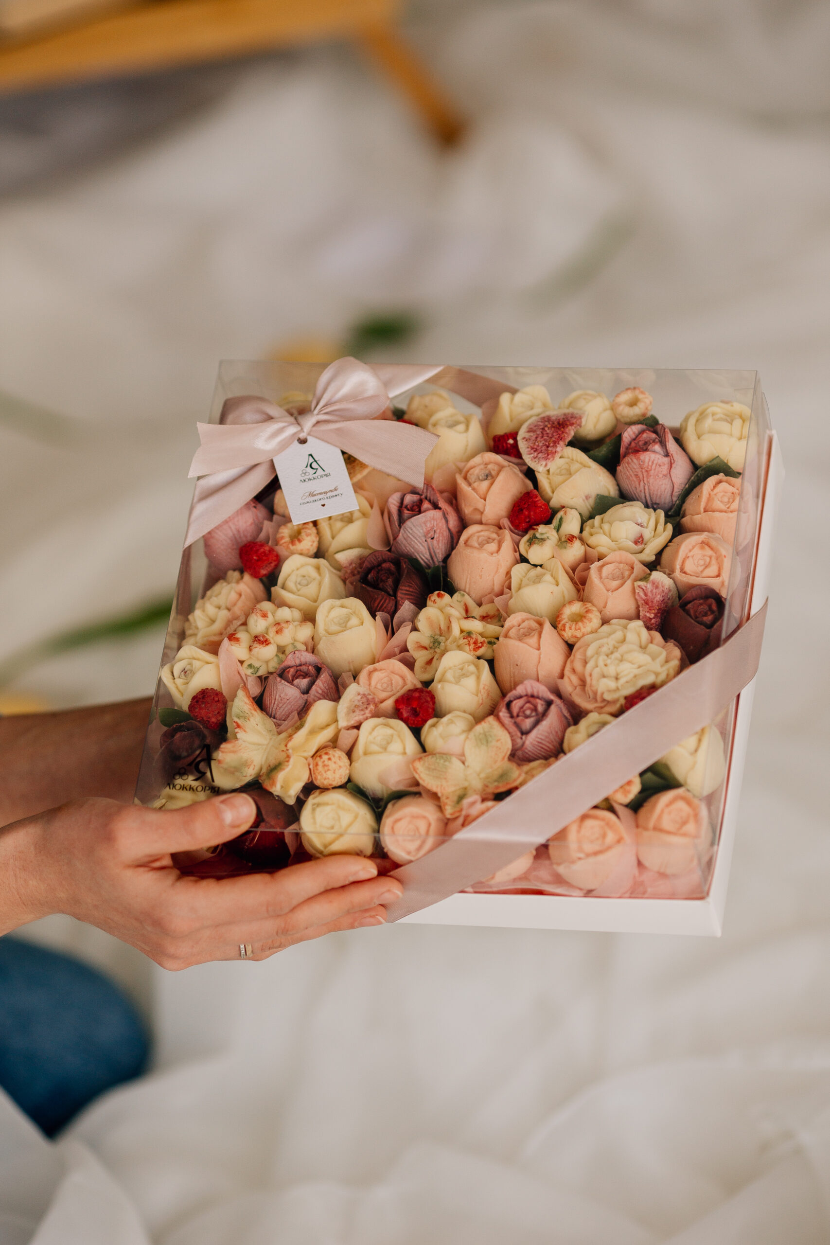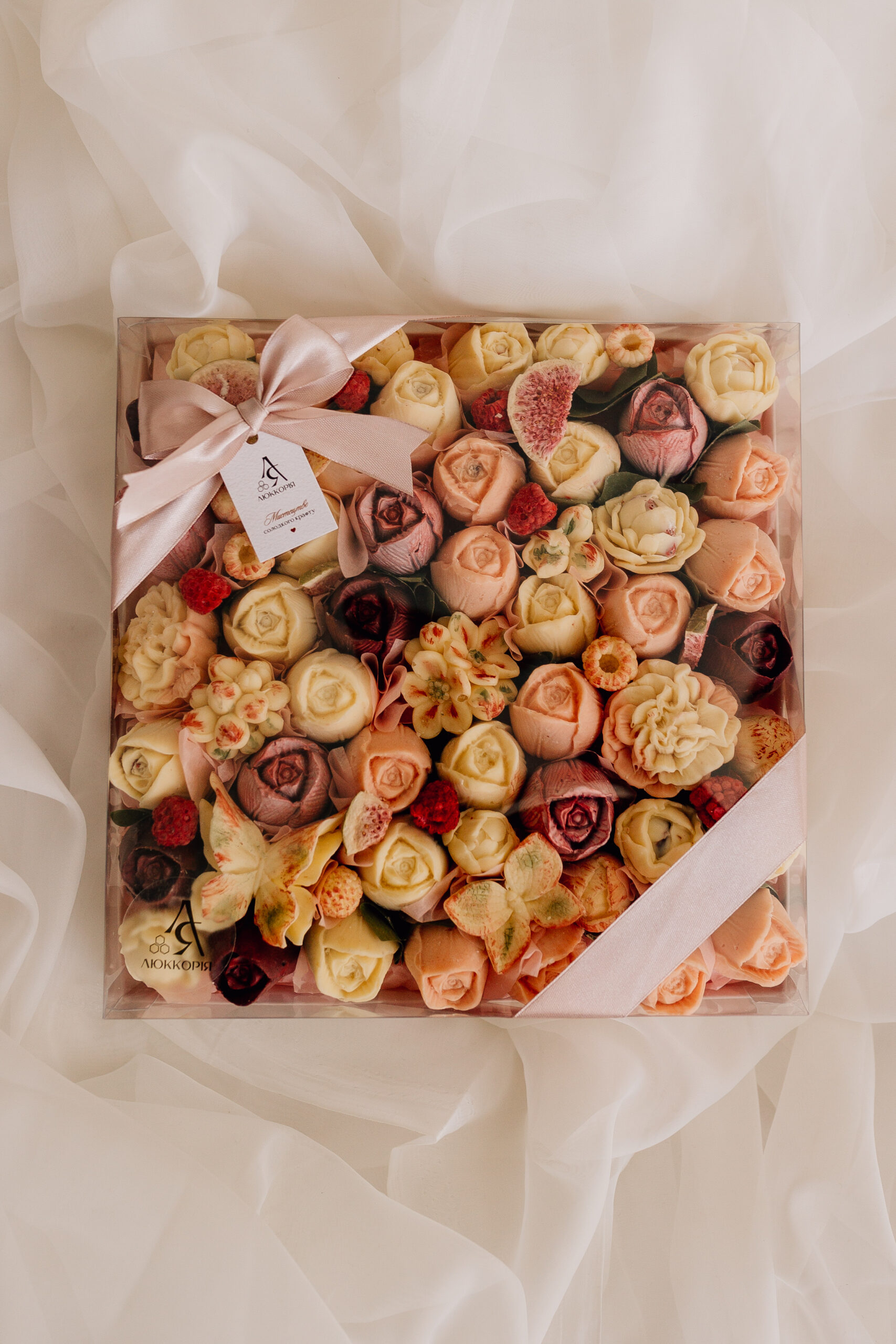 Прозорий бокс додає легкості та преміального вигляду, а стрічка гармонійно завершує композицію.