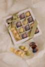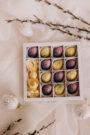 Кожне яйце виготовлене з бельгійського шоколаду та має власний смак — від ніжних кремових до насичених горіхових і ягідних поєднань. Декоративні елементи та делікатне оформлення роблять набір не лише смачним, а й естетичним подарунком.