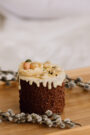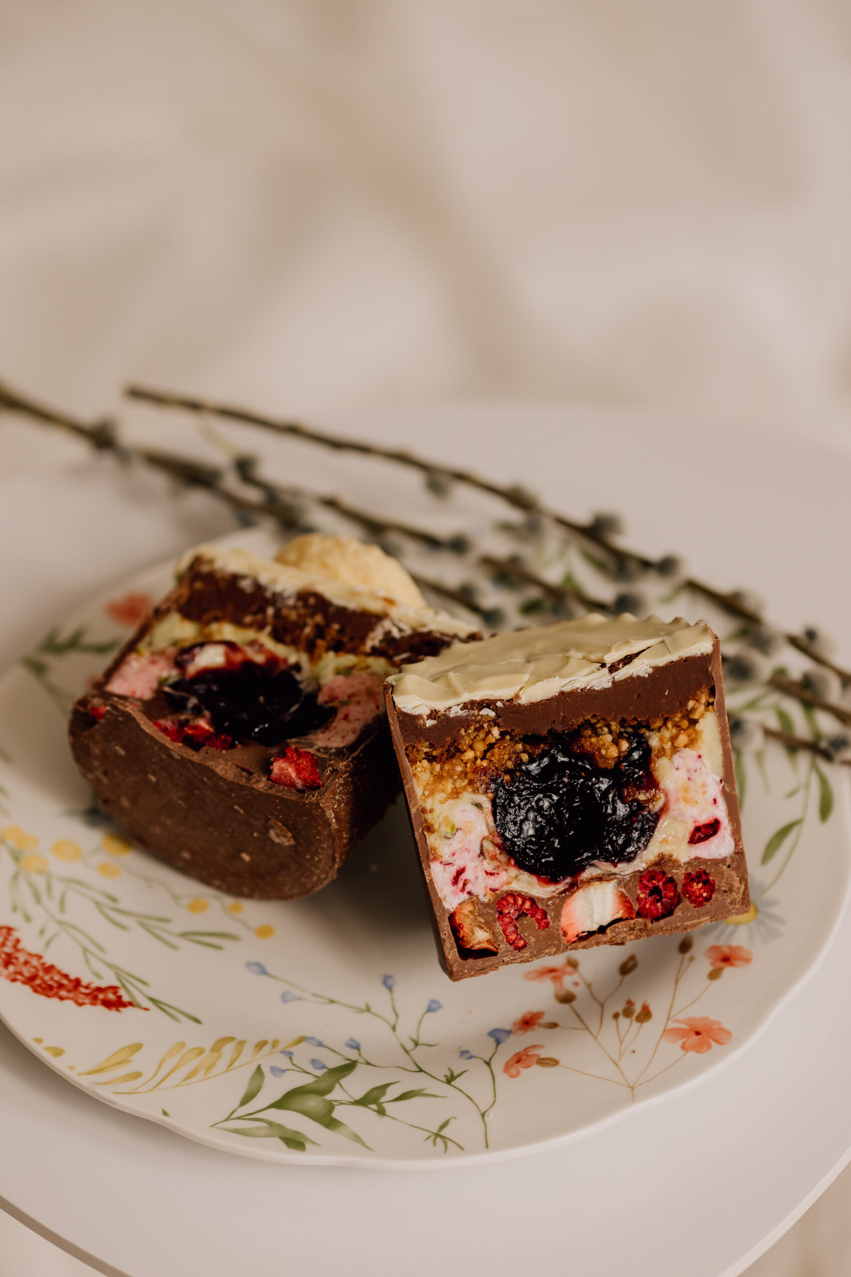 Сучасний авторський десерт у форматі паски, який поєднує ніжні кремові текстури, ягідну кислинку та насичений шоколадний смак. Кожен шар доповнює інший, створюючи гармонійне та багате поєднання смаків.