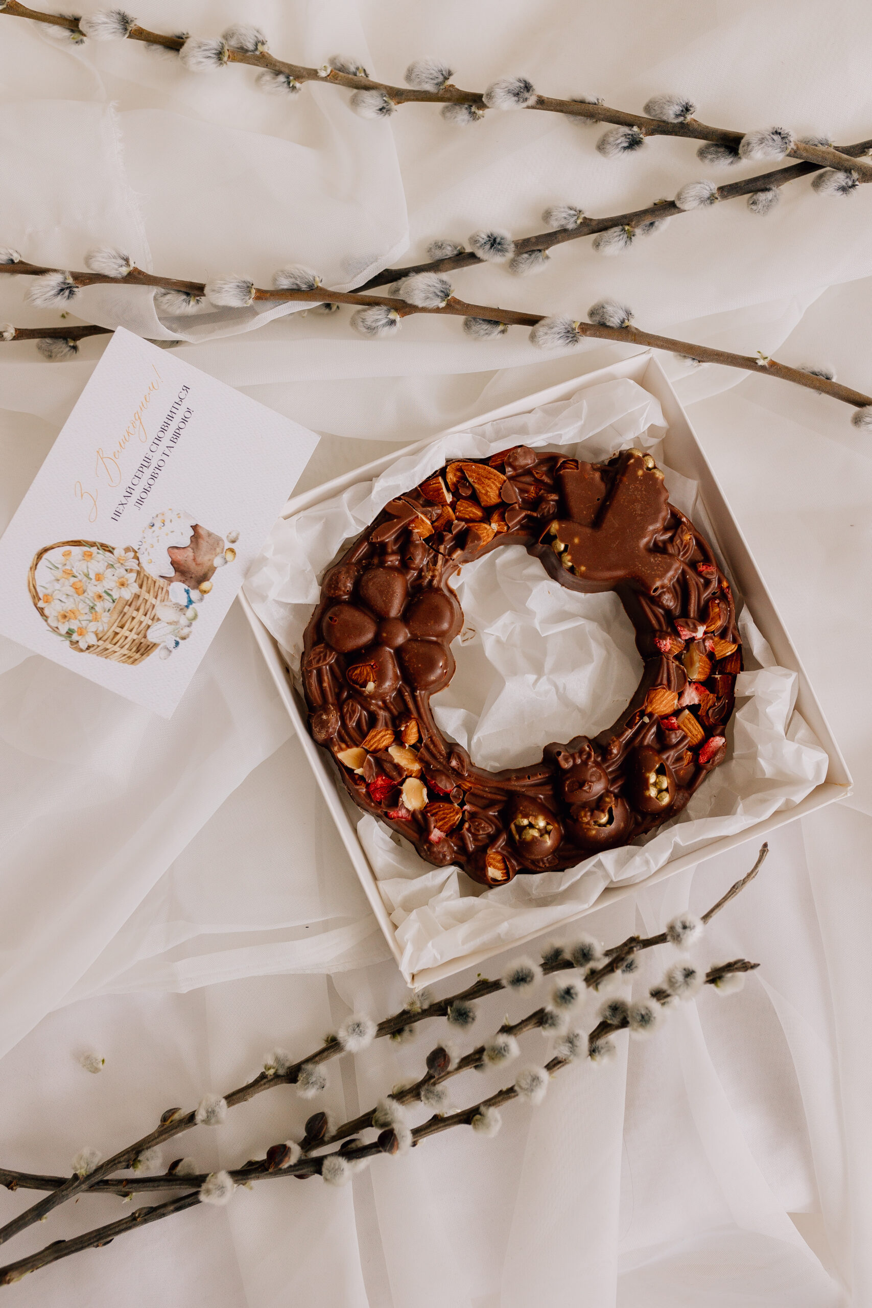 Атмосферний десерт у формі вінка, створений з бельгійського шоколаду з додаванням горіхів та ягід. Стильний і смачний варіант подарунка до Великодня або як особливий солодкий комплімент 💛